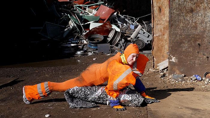 that intertwines physical and conceptual elements to critically examine key aspects of our neoliberal society. The performer, dressed in a custom-made full-body suit, embodies a visual intersection between protective workwear and the romanticized elegance of a princess gown. The suit itself becomes a symbol of the tension between physical labor and an idealized, almost unattainable notion of perfection.
