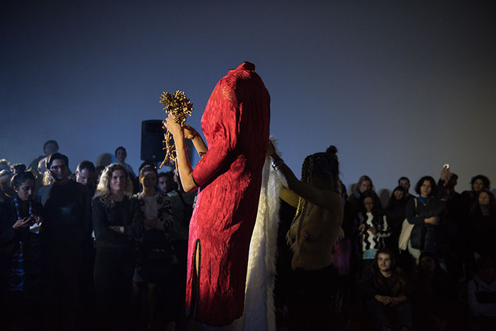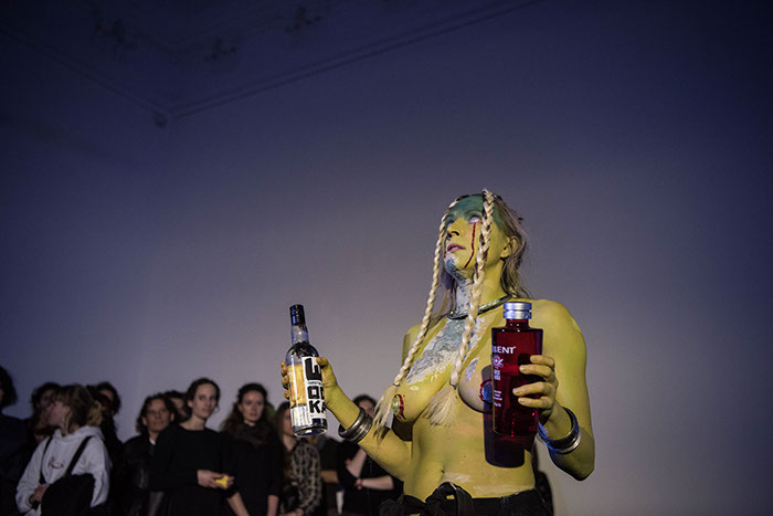 In Ernestyna Orlowskas zur Vernissage aufgeführtem "God is a Girl, extended Version. Night Time is the Right Time" wird die Atmosphäre beklemmend. Zuerst werden kommentarlos rollende Wodkaflaschen in den Raum gefegt, bevor zwei abenteuerlich gewandete Gestalten, eine davon kopflos, eine schauerliche Show beginnen. Es geht um Rausch und Exzess, Voodoo und Hedonismus, aber auch um Käuflichkeit.