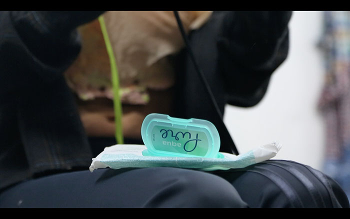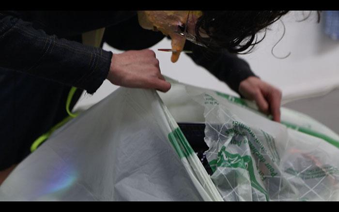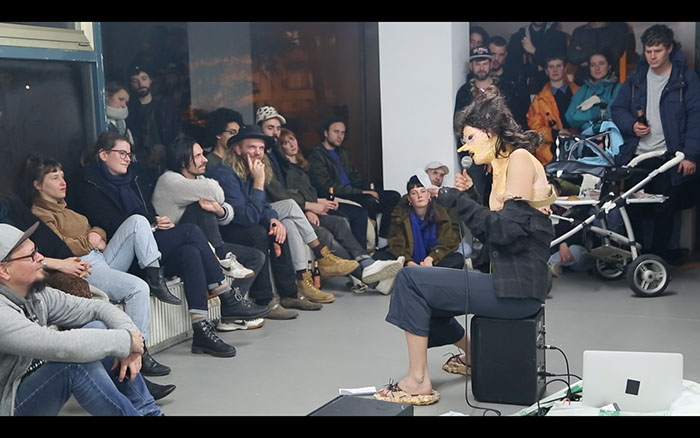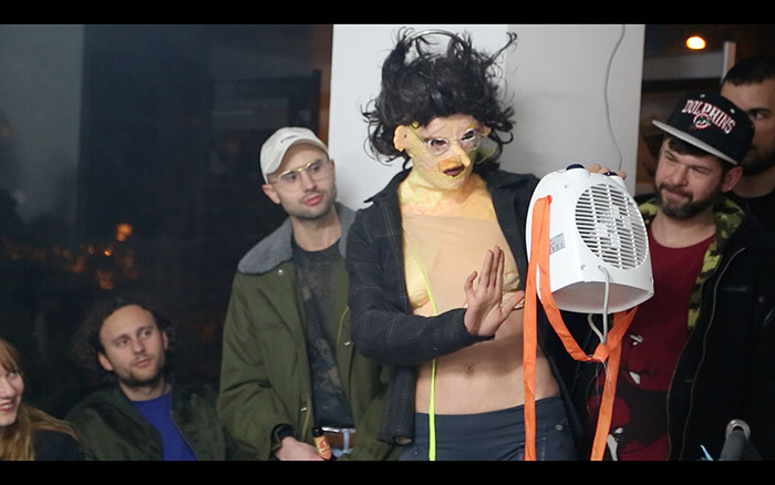 out of the breast and forms a cup out of it, let’s audience members drink from it, pulls out children’s song texts from the wet wipe box and performs them.