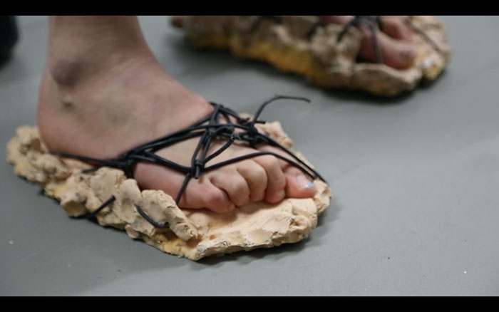 The objects in the space were created in the process of materializing the investigation of these motherhood-monsterhood constructs. There is an oversized pacifier from unburned clay attached to a necklace that says Sorry Not Sorry. Actually sucking it would dissolve the unburned clay. Clay would be sucked in by a human, and the first human, according to biblical creation myths, was also created by clay.